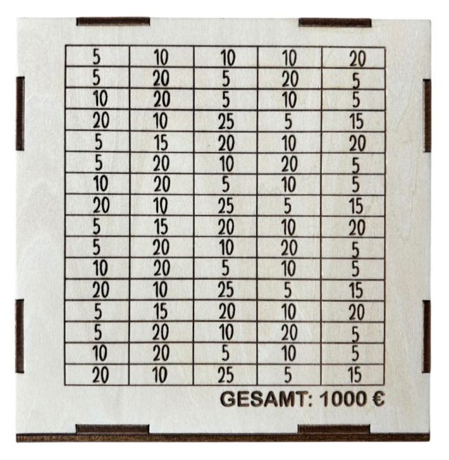 Jedes mal, wenn du etwas Geld übrig hast oder Wechselgeld bekommen hast, streichst du den Betrag auf der Rückseite der Sparbox durch, bis du 1.000€ angespart hast.